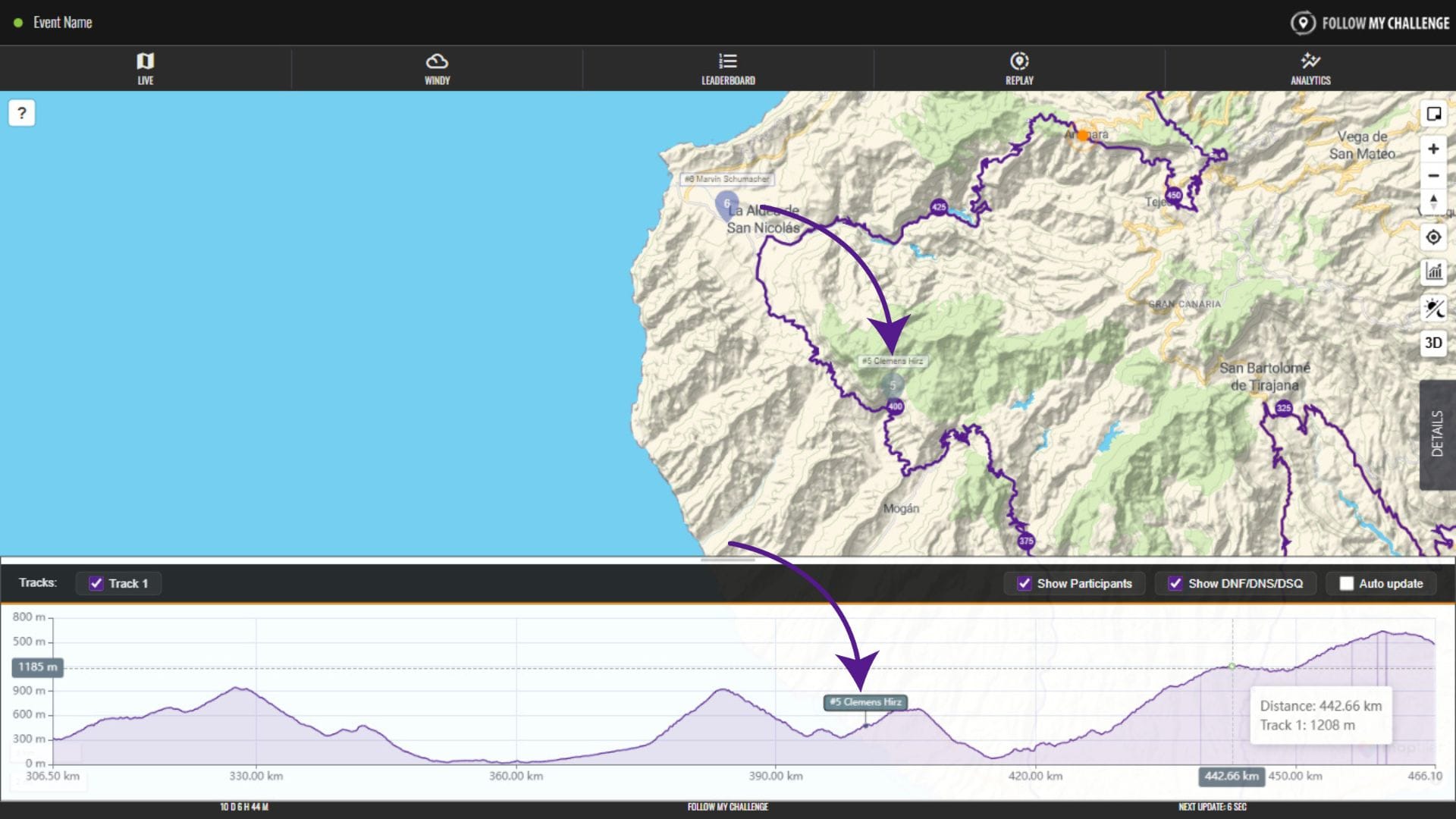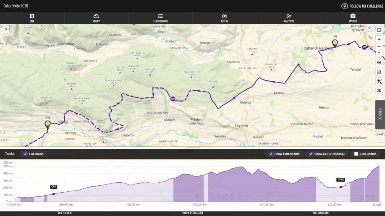 More filtering has also been built in, with the option to hide DNF participants or hide/show different routes. And checkpoints now appear on the profile, allowing you to work out where they sit relative to participants in terms of elevation. Finally, you can also click or hover on a point on the elevation profile and it will highlight that point on the route, as well as showing you the elevation and distance.