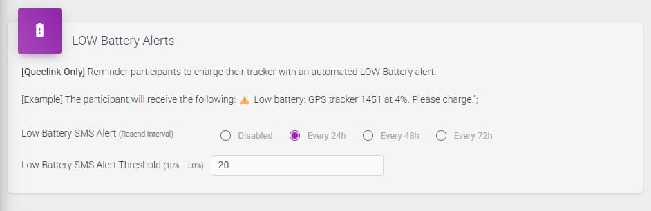 The alerts only work with trackers that report a battery percentage (such as our Queclink devices) and require a phone number – including the full country code – to be loaded for each participant. Organisers can opt in to low-battery alerts when completing our agreement form, and then simply need to provide a participant list with phone numbers that we can import during the map build.
